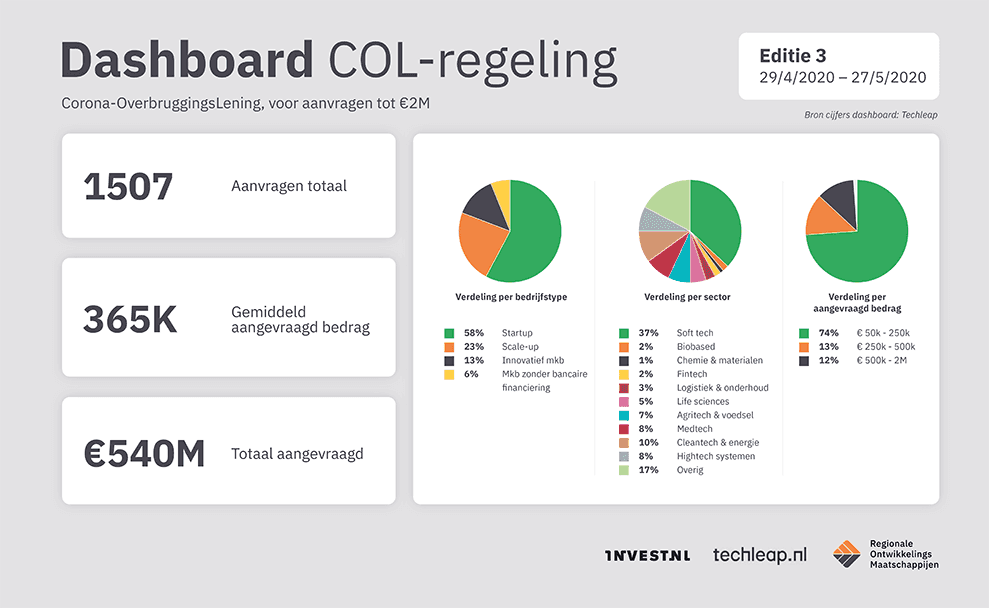 Het kabinet maakte woensdag 20 mei bekend dat er in aanvulling op een eerdere tranche van € 100 miljoen nog eens € 150 miljoen beschikbaar komt voor startups, scale-ups en innovatieve mkb-ers. Gezien de grote hoeveelheid aanvragen is hier grote behoefte aan. Bedrijven kunnen via de COL een aanvraag vanaf € 50.000,- indienen en gebruik maken van gunstige voorwaarden. De regionale ontwikkelingsmaatschappijen verstrekken de leningen.
